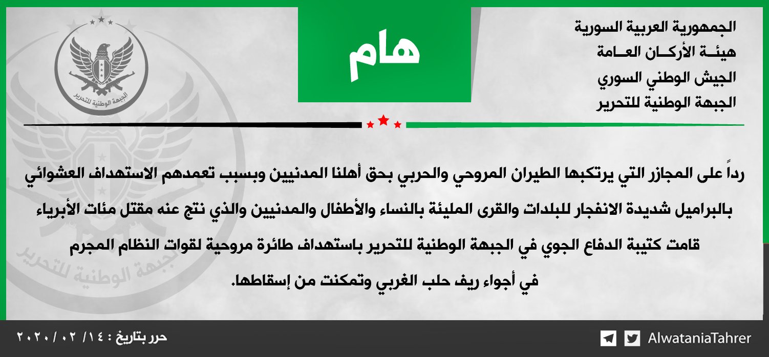 「ヘリコプターと戦闘機が我らが民間人に対して行う虐殺への報復として、そしてまた彼らが爆発性の高い「樽爆弾」で女性、子ども、そして民間人が多くいる町や村を無差別に狙い、何脈万という無垢の人々を死に至らしめているがゆえ、国民解放戦線の防空大隊は犯罪者体制軍のヘリコプター1機をアレッポ市西部郊外上空で狙い、これを撃墜した」。