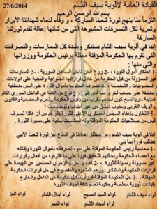 シャームの剣旅団は声明を出し、シリア革命反体制勢力国民連立アフマド・トゥウマ暫定内閣の解散とトゥウマ首班の処罰を求めた。