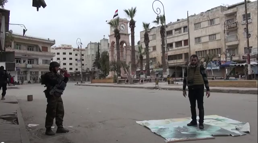 反体制ジャーナリストのハーディー・アブドゥッラー氏はイドリブ市中心部にある時計台広場で、アサド大統領の写真を踏みつけながら現地取材を行い、ユーチューブ(https://youtu.be/XCpiEmtFMKw)を通じて配信した。