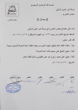 アレッポ県で活動するヌールッディーン・ザンキー運動のシューラー評議会は声明を出し、タウフィーク・シハーブッディーン総司令官を健康上の理由で解任し、アリー・サイードゥー氏を27日付で新司令官に任命したと発表した。