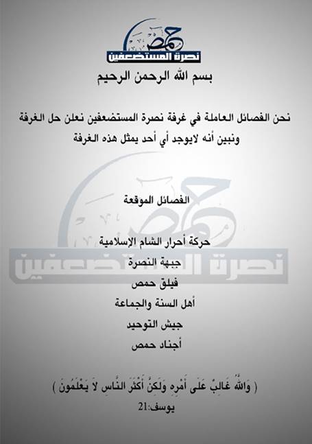ヒムス県北部で活動していた「ヌスラト・ムスタドアフィーン」作戦司令室は声明を出し、作戦司令室を解体すると発表した。