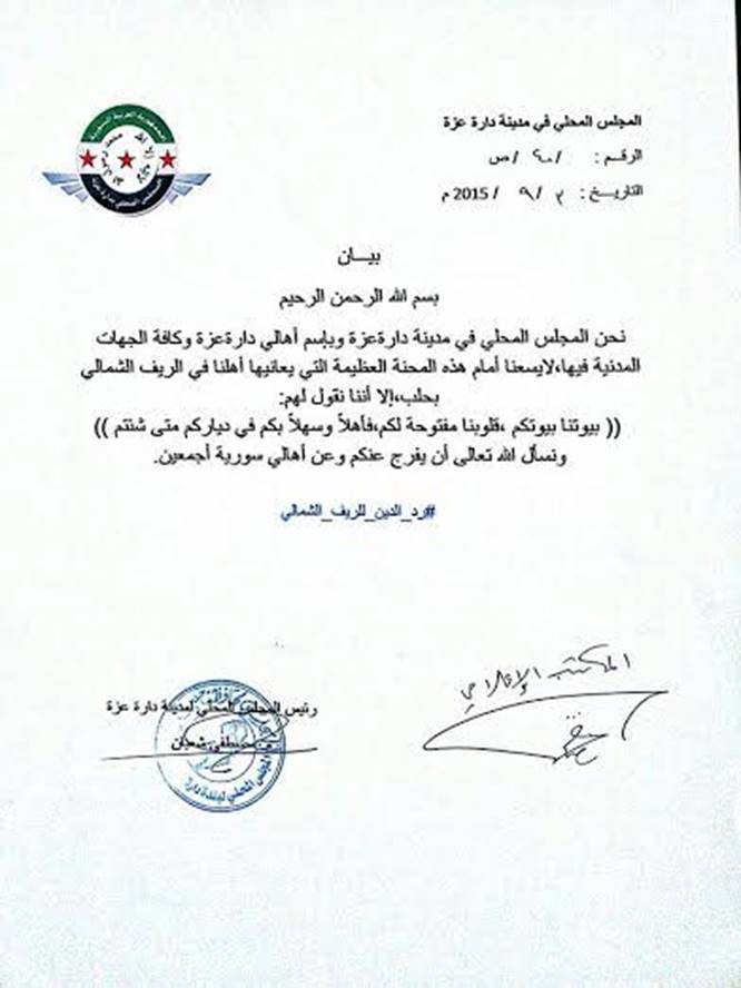アレッポ県のダーラト・イッザ市地元評議会は声明を出し、米トルコ両政府が設置合意したとされる「安全地帯」へのダーイシュ(イスラーム国)の進攻への対策として、ダーラト・イッザ市住民が県北部からの避難民を受け入れる用意があると表明した。