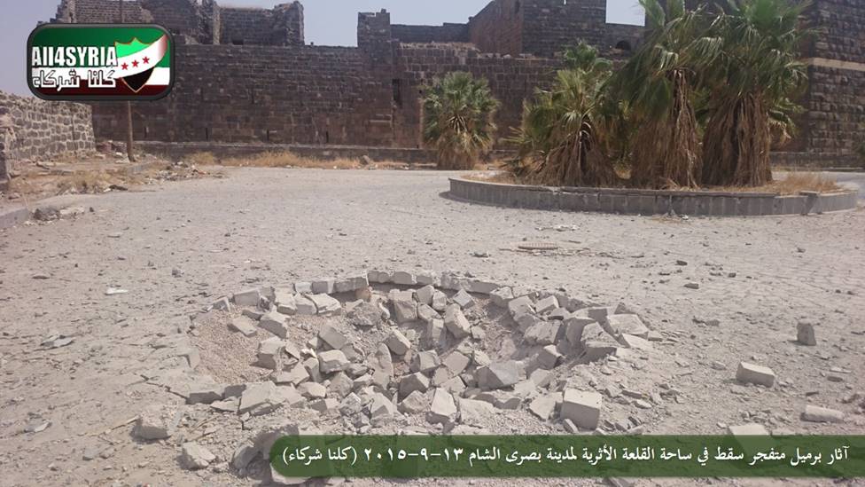 クッルナー・シュラカー(9月16日付、アフマド・ハリーリー記者)は、シリア軍ヘリコプターが13日、UNESCO世界文化遺産に登録されているダルアー市ブスラー・シャーム市内の古代ローマ劇場近くに「樽爆弾」を投下し、劇場前の広場と堀の一部が被害を受けたと伝え、その写真を公開した。