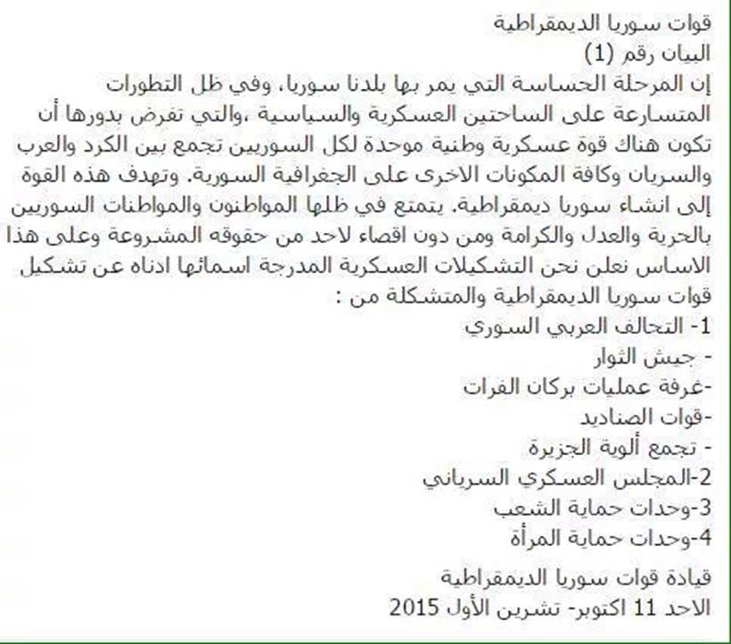 『ハヤート』によると「シリア民主軍」は約5万人の兵力を擁し、以下の武装組織が参加しているという:
