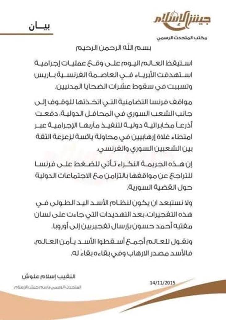 イスラーム軍のイスラーム・アッルーシュ大尉は声明を出し、13日のパリでの同時多発テロに関して、「各国諜報機関の腕が過激なテロリストを操って自らの犯罪的な意思を実行に移し、シリア国民とフランス国民の信頼を揺るがそうとしている」と主張し、事件の背後に欧米諸国がいると暗に批判した。