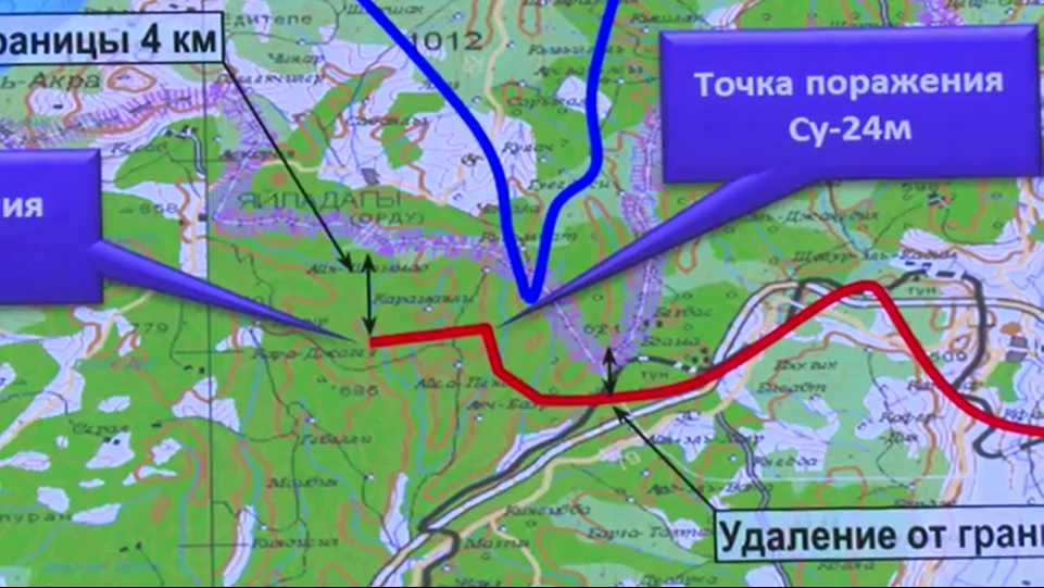 ルドスコイ中将によると、ロシア軍戦闘機はトルコ領内を侵犯しておらず、シリア領空(標高6,000メートルの上空)を飛行中に撃墜され、機体は国境から4キロ離れたシリア領内に墜落した。