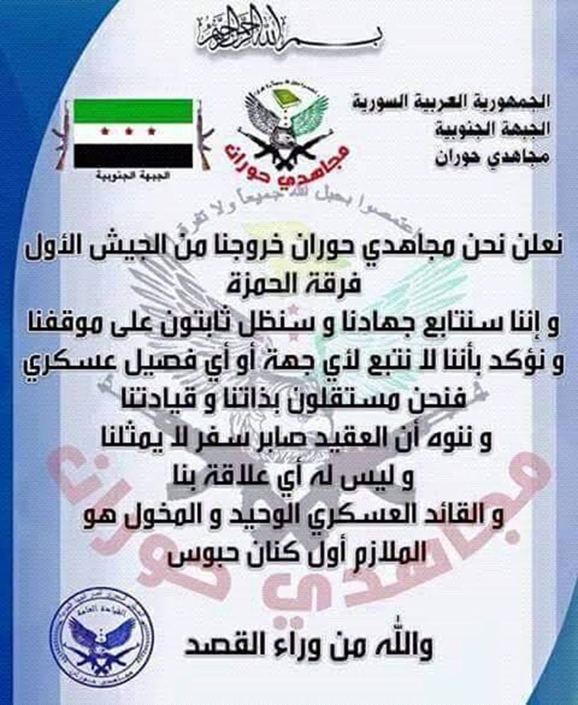 また、これに先立ち、ハウラーン・ムジャーヒディーン旅団も南部戦線第1軍からの離反を宣言した。