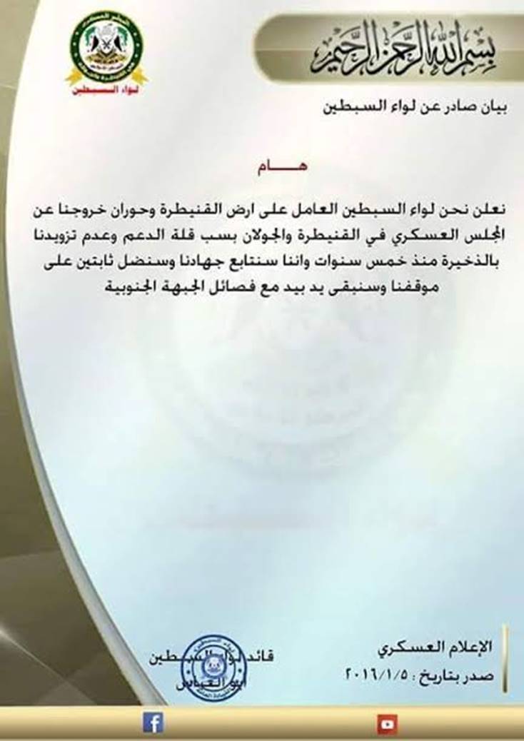 インターネットを通じて発表した声明のなかで、サブティーン旅団は、南部戦線所属組織からなるクナイトラ県軍事評議会からの支援不足を離反の理由として挙げている。