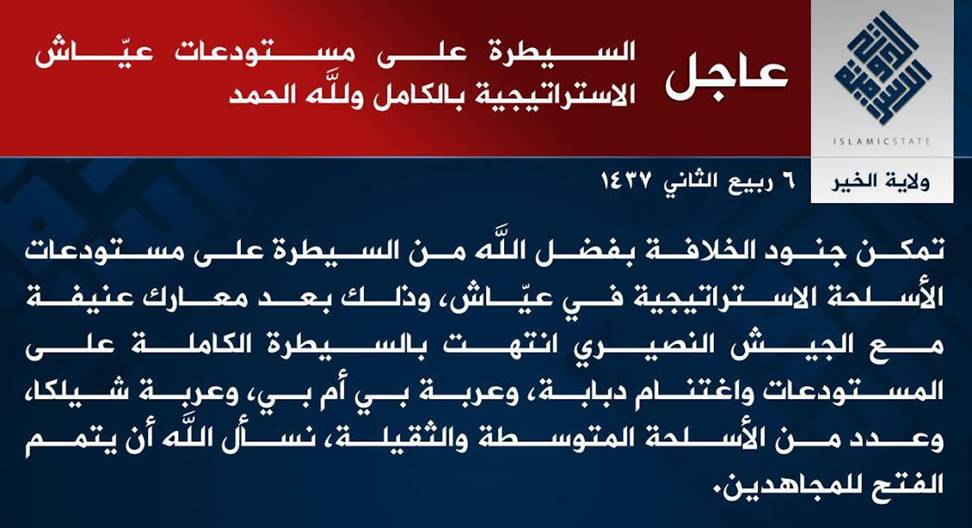 一方、ダーイシュ(イスラーム国)ハイル州(ダイル・ザウル県のこと)は声明を出し、「ヌサイリー軍」(シリア軍)との戦闘の末に、アイヤーシュ村の武器庫を制圧したと発表した。