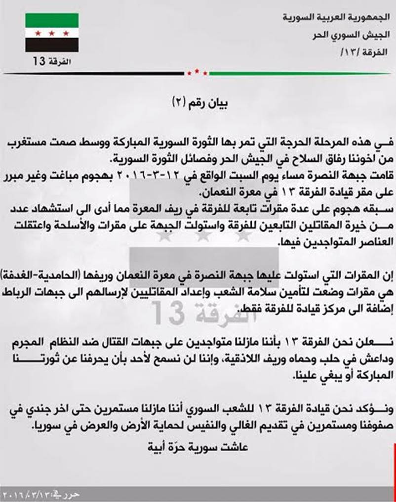 拠点を奪われた第13師団はツイッターのアカウントを通じて、「ヌスラ戦線は我々の全拠点を襲撃し、武器弾薬を奪った。我々は彼らがこの武器を他の部隊に対して使用しないことを望む」とメッセージを発信、また「我々は(ヌスラ戦線指導者のアブー・ムハンマド・)ジャウラーニー氏によるこの征服を祝福したい」と揶揄した。