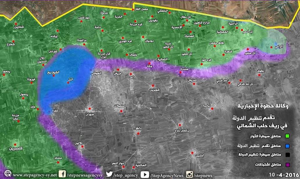 アレッポ県では、シリア人権監視団、ドゥラル・シャーミーヤ(4月10日付)などによると、ダーイシュ(イスラーム国)がハワール・キリス作戦司令室との戦闘の末、県北西部シャイフ・リーフ村、バッル村、バラーギーダ村、ヤフムール村、ジャーリズ村、タッル・フサイン村を制圧した。