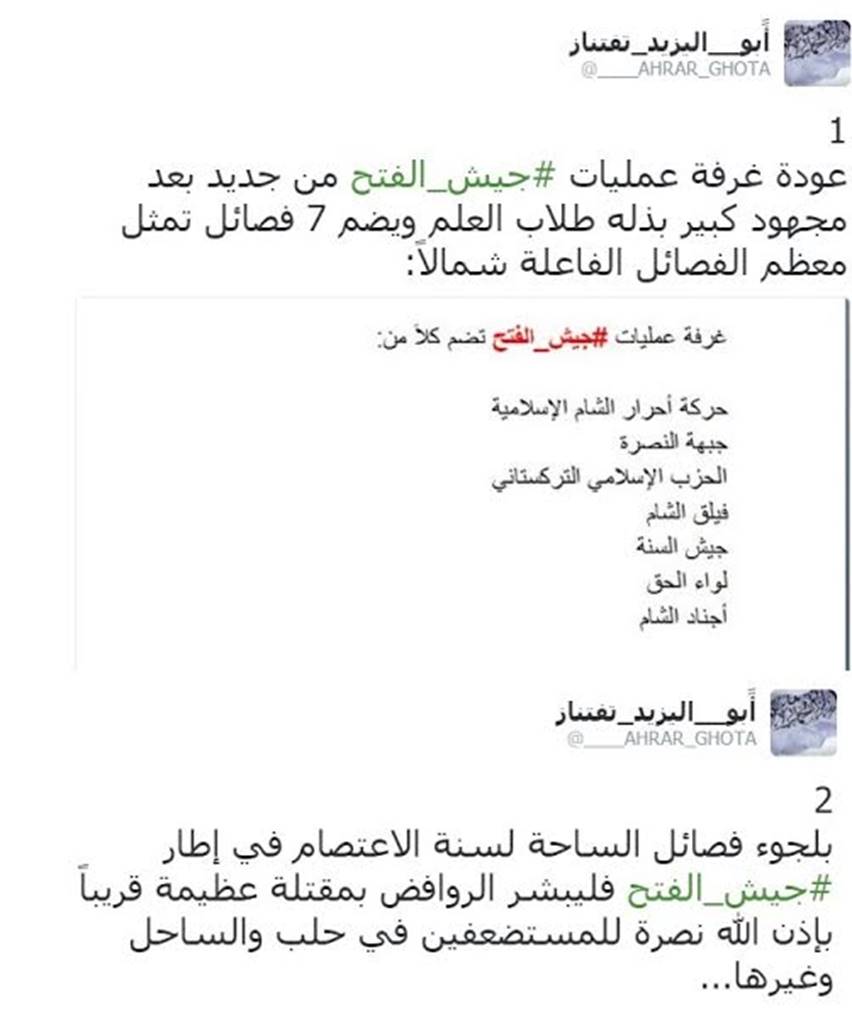 シャーム自由人イスラーム運動の幹部の一人アブー・ヤズィード・タフタナーズ氏は、ツイッターの自身のアカウントを通じて、「ファトフ軍作戦司令室は学徒たちの多大なる努力を受け、新たに復活した」と発表、イドリブ県やアレッポ県北部で活動するアル=カーイダ系および非アル=カーイダ系のジハード主義武装集団7組織によって再編されたことを明らかにした。