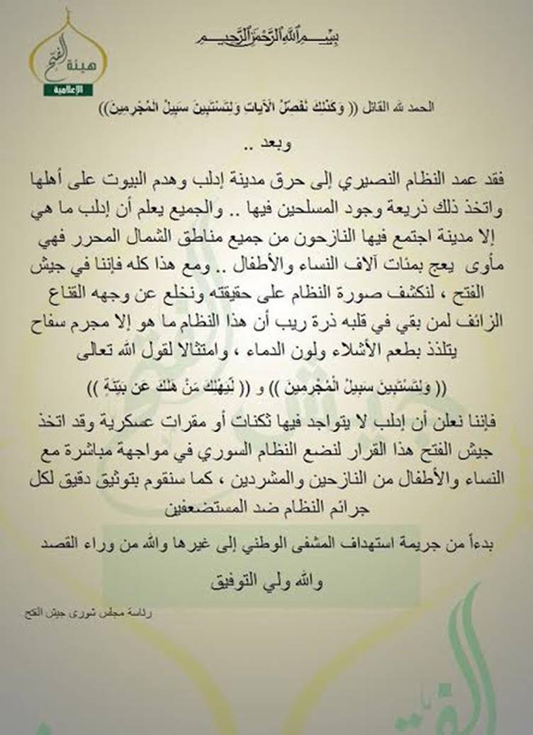 ファトフ軍の広報委員会は声明を出し、イドリブ市におけるすべての軍事拠点、兵舎の撤収を決定したと発表した。