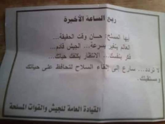 散布されたビラは、「軍武装部隊総司令部」の名で「最後の15分…武装している者よ、真実の時が来た…世界は急速に変化している…軍がやって来る…よく考えろ…延命するための猶予を与える…躊躇するな…自分の命と未来を守るために武器を速やかに放棄せよ」などと書かれている。