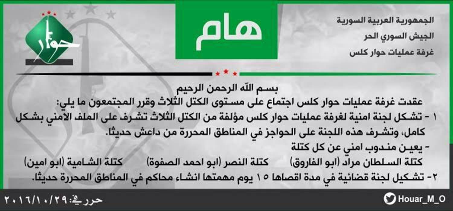 トルコ軍航空部隊および戦車部隊と全面共闘し「ユーフラテスの盾」作戦を遂行する反体制武装集団(ハワール・キリス作戦司令室)は声明を出し、アレッポ県北部および北東部の「解放区」の自治を担うための機関として「治安委員会」を発足したと発表した。