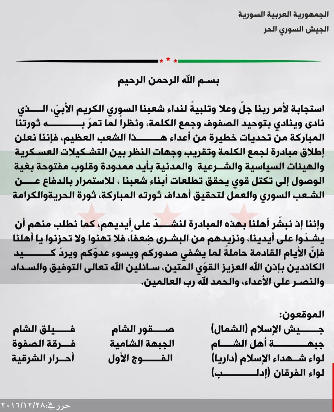 共同声明は、「自由シリア軍」の名で出され、シャームの鷹旅団、シャームの民戦線(ムジャーヒディーン軍、シャーム革命家、バヤーリク・イスラーム)、シャーム戦線、シャーム軍団、イスラーム殉教者旅団(ダーライヤー市)、イスラーム軍、覚醒師団、第1連隊、東部自由人、フルカーン旅団(イドリブ県)が参加している。