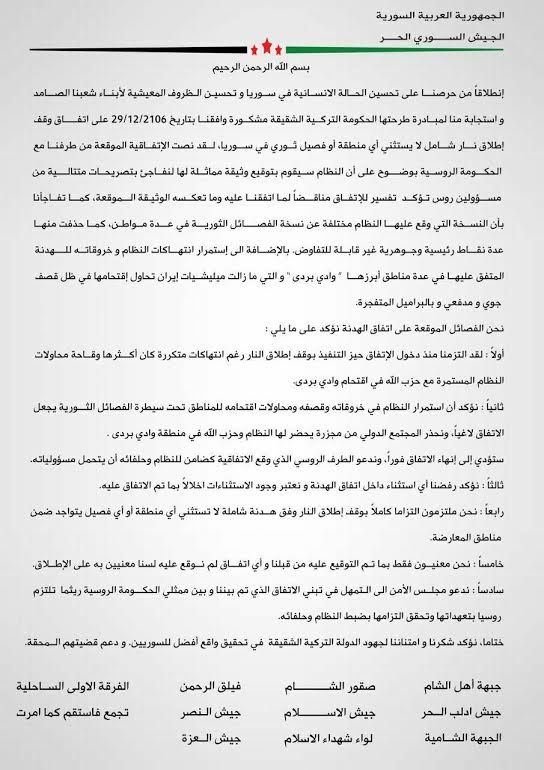 ロシア・トルコ仲介によるシリア政府との停戦に応じた反体制武装集団3組織を含む11組織は共同声明を出し、ダーイシュ(イスラーム国)とシャーム・ファトフ戦線を停戦対象から除外するとした「例外」に関して、「ロシア側高官による声明に驚かされた…。反体制派との合意に反している」としたうえで、いかなる「例外」をも拒否すると表明、「革命組織」の支配下にある地域へのシリア軍による停戦違反と空爆・攻撃継続を非難した。