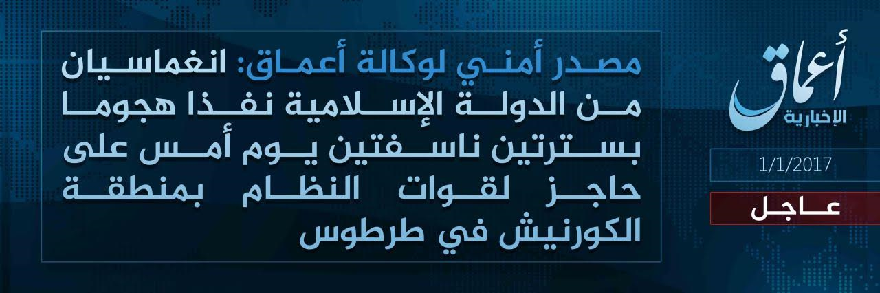 この自爆攻撃に関して、アアマーク通信(1月1日付)は、「タルトゥース市コルニーシュ地区にあるシリア軍検問所に対して新年に、イスラーム国の特攻自爆戦闘員(インギマースィー)が爆弾攻撃を行った」と発表した。
