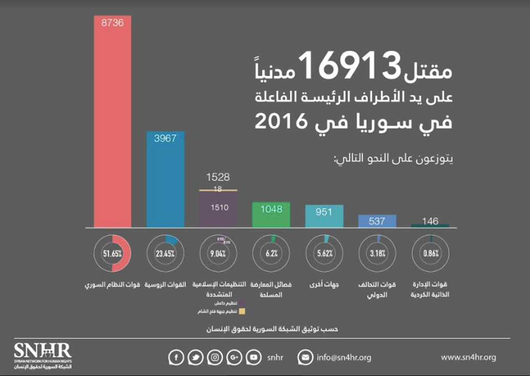 シリア人権ネットワークは、2016年の1年間で、シリア軍とロシア軍による攻撃で死亡した民間人の数が1万6,913人にのぼったとする統計データ(http://sn4hr.org/blog/2017/01/01/30737/)を発表した。