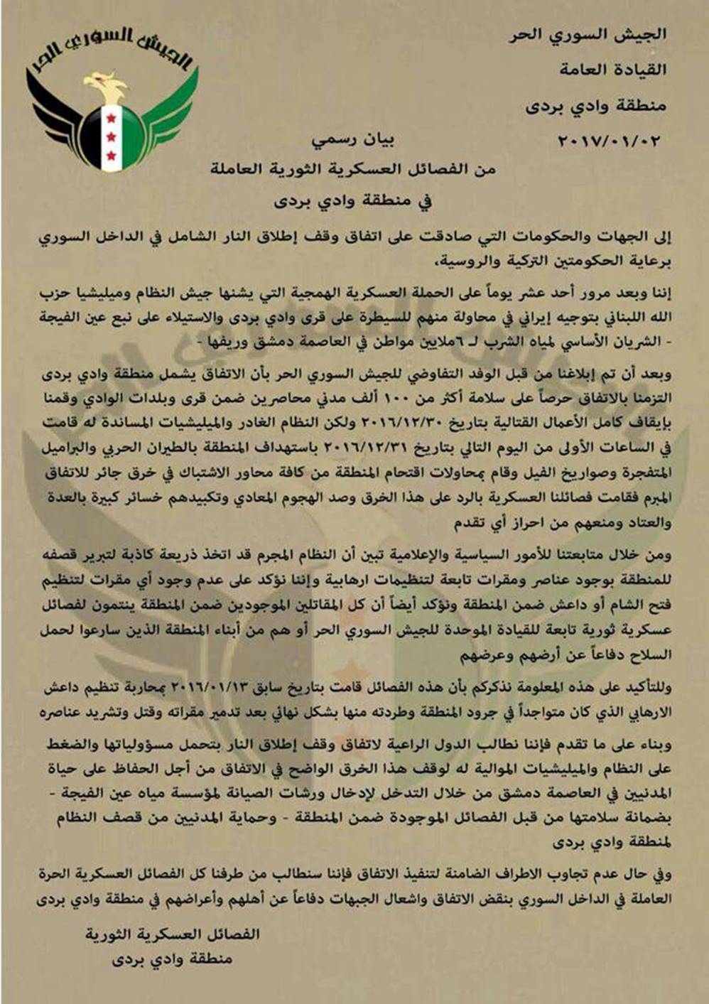 ダマスカス郊外県バラダー渓谷一帯で、シリア軍、ヒズブッラー戦闘員などからなる親政権武装勢力と戦闘を続けているという「バラダー渓谷地区革命軍事諸派」を名乗る集団は声明を出し、同地にはシャーム・ファトフ戦線は存在しないと主張した。