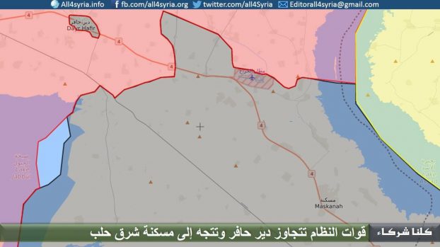 アレッポ県では、クッルナー・シュラカー(3月26日付)によると、シリア軍がダイル・ハーフィル市南東部でダーイシュ(イスラーム国)と戦闘を続け、ウンム・ティーナ村、ラスム・ジャイスィー村、タッル・アブー・マクバラ村、ジャフィーラト・ガザール村を制圧し、アレッポ市とラッカ市を結ぶ街道に位置するダーイシュの拠点都市マスカナ市に向けて進軍を続けた。