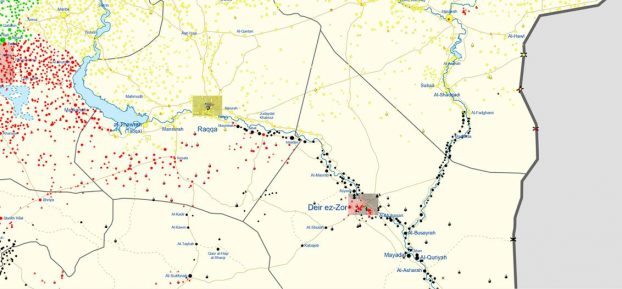 ラッカ県では、ヒズブッラーの中央戦争広報局(7月31日付)によると、シリア軍と親政権武装勢力はダイル・ザウル県との県境に位置するマアダーン町を包囲するかたちで、同市北西部一帯に進攻し、ユーフラテス川右岸(南岸)に到達、ズール・シャマル村、スブハ村、シャリーダ村、ジャバリー村、アルバヒー村、ラジャム・ハールーン村、タッル・マルード村のダーイシュ(イスラーム国)を包囲した。