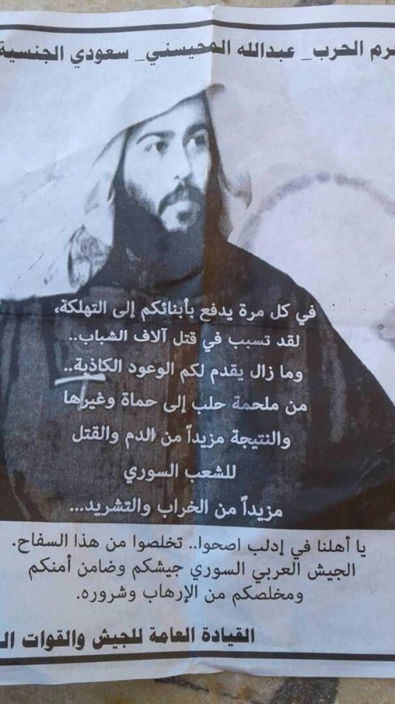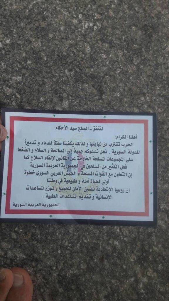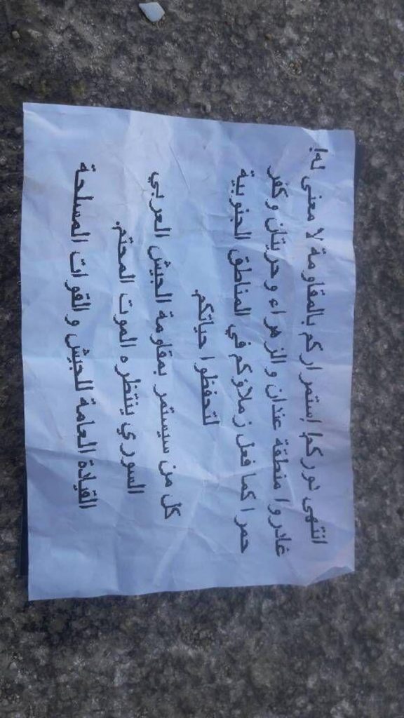 アレッポ県では、クッルナー・シュラカー(7月31日付)によると、シリア軍がアレッポ市北部郊外のフライターン市、アナダーン市、カフルハムラ村、ハイヤーン町、バヤーヌーン町など反体制武装集団支配地域にビラを空中散布し、戦闘員に対してアレッポ市西部郊外のザフラー地区から退去するよう呼びかけた。
