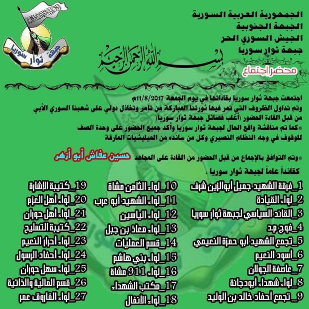 シリア革命家戦線は声明を出し、27の武装集団が10日に会合を開き、フサイン・アッファーシュ氏を新司令官に任命したと発表した。