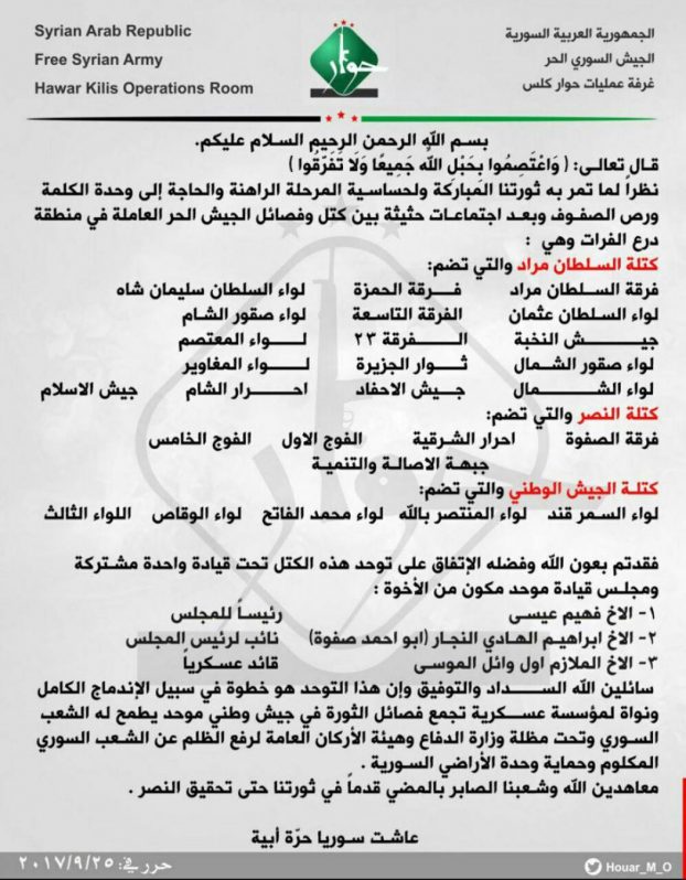 声明は、ハワール・キリス作戦司令室の名で出され、2016年8月から2017年3月にかけて「ユーフラテスの盾」作戦の名のもと、トルコ軍とともに実効支配を確立したアレッポ県北部の「ユーフラテスの盾」地域で活動する自由シリア軍諸派を統合したことを明らかにした。