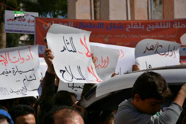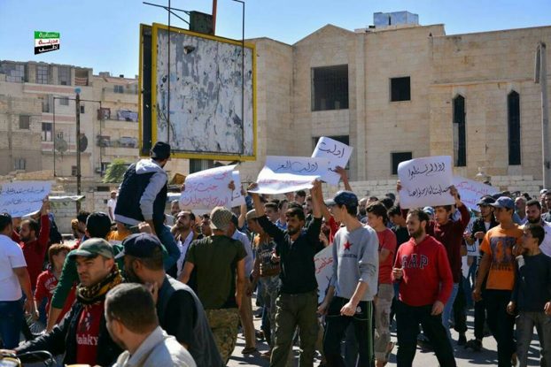 デモは、10日に同市中心街のシュアイブ・モスク近くにある金細工商に何者かが押し入り、アイマン・アブドゥルマーーン・クーサラ氏とその父親を殺害し、金細工約5キロ(1万ドル相当)を持ち去った事件を受け、イドリブ市評議会が強盗犯罪と治安状況に抗議するために呼びかけたもの。