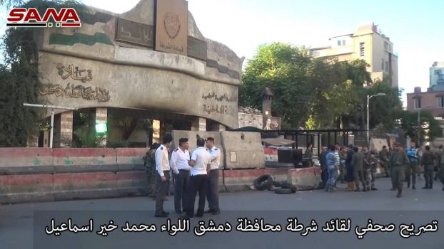 ダマスカス県では、ムハナド・シャッアール内務大臣によると、中心街のハーリド・ブン・ワリード通りに面するダマスカス県警察に「テロリスト」3人が突入を試みたが、守衛が侵入を阻止、うち2人が建物前で着用していた自爆ベルトを爆発させ、1人は逃走後にバーラ市場入口で同じく自爆した。