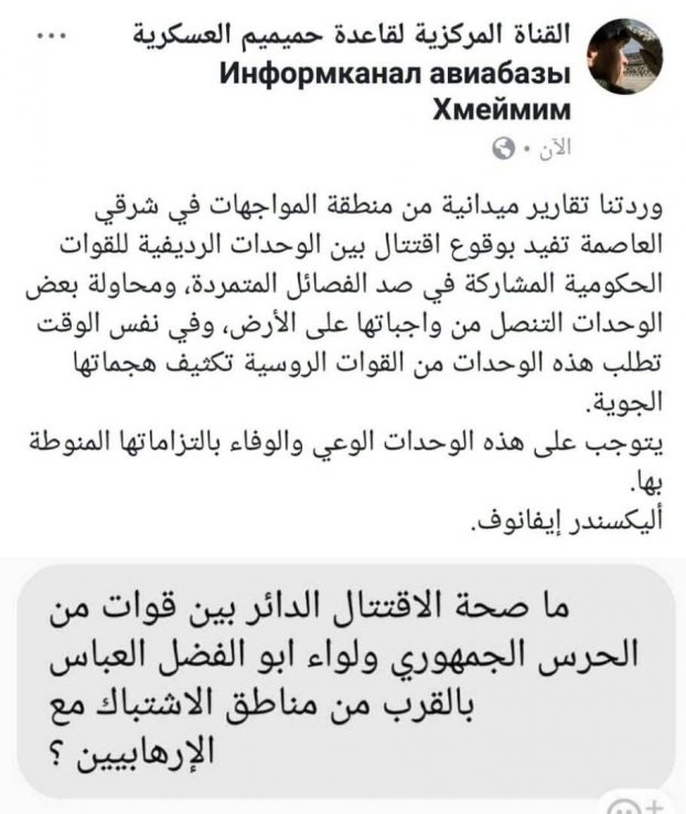 「フマイミーム軍事基地中央チャンネル」(https://www.facebook.com/Russianmilitaryinsyaria/)を名のる反体制系のフェイスブック・アカウントは、ダマスカス郊外県東グータ地方ハラスター市近郊の車輌管理局の解囲作戦に参加している共和国護衛隊とイラク・イスラーム革命防衛隊の支援を受けるイラク人民動員隊の一つアブー・ファドル・アッバース旅団が衝突、交戦したことを明らかにした。