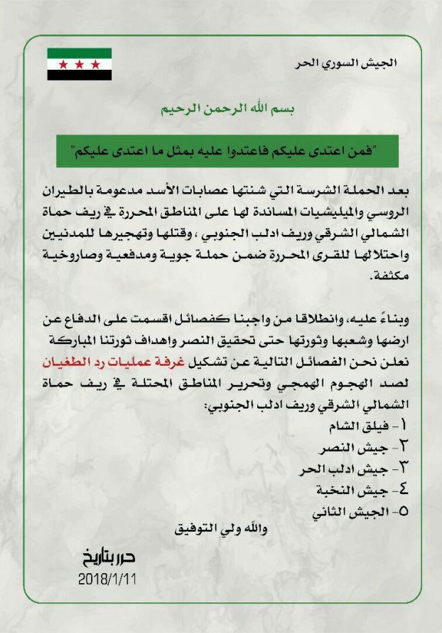 「穏健な反体制派」、ないしは自由シリア軍と目される反体制武装集団5組織は共同声明を出し、シャーム解放機構などからなる武装集団に対するシリア軍の攻勢で喪失したイドリブ県南部およびハマー県の支配地域の奪還に向け、新たに「暴君への抗戦」作戦司令室を設置したと発表した。