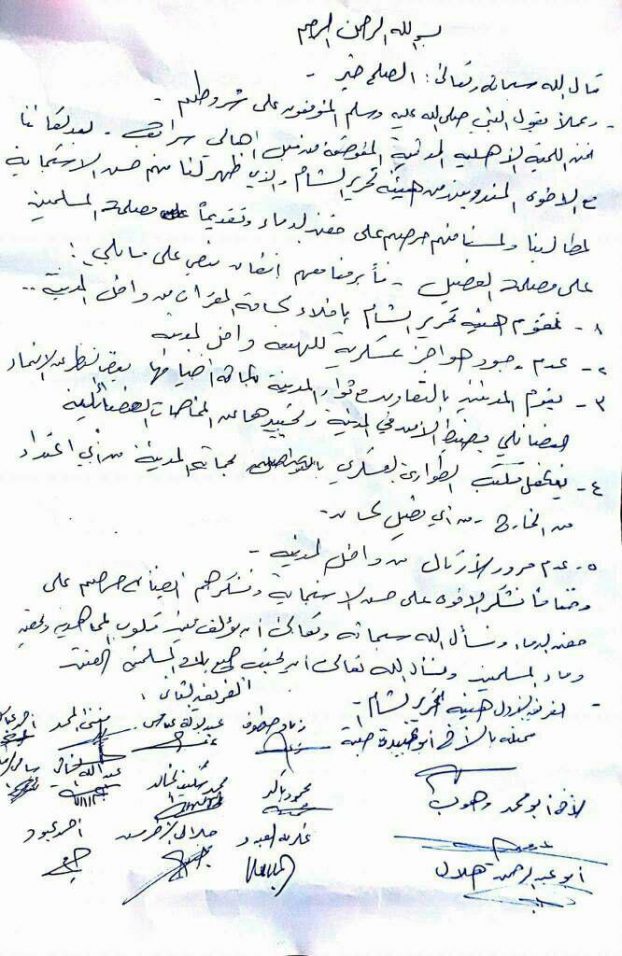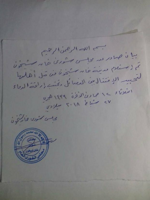 イドリブ県、アレッポ県で対立を激化させているシャーム解放機構とシリア解放戦線は、イドリブ県のハーン・シャイフーン市、サラーキブ市、カフルダルヤーン村での戦闘を行わないことで合意した。