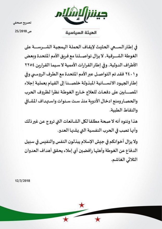イスラーム軍の政治委員会は声明を出し、国連の仲介により、ダマスカス郊外県東グータ地方から負傷者を搬送することをロシアと合意したと発表した。