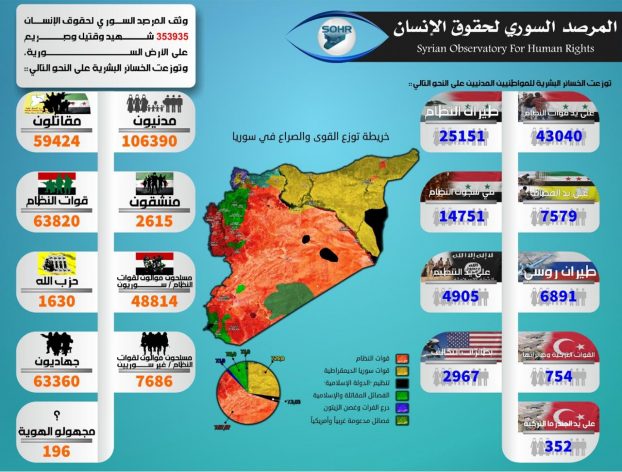 加えて、約45万人がシリア政府の拘置所での拷問で死亡、5,200人以上がダーイシュによって拉致・殺害され、4,700人以上がシリア軍や親政権民兵に捕捉・殺害され、2,000人以上が「武装勢力、イスラーム主義勢力、ダーイシュ、シャーム解放機構」によって拉致・殺害されたと推計されるという。
