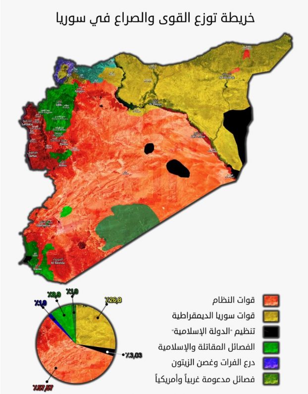 一方、シリア全土のうち、シリア政府の支配下にあるのは10万6,508平方キロメートル(57.57%)、西クルディスタン移行期民政局(ロジャヴァ)の支配下にあるのは4万9,653平方キロメートル(26.8%)、「武装勢力、イスラーム主義勢力、シャーム解放(戦線)」の支配下にあるのは2万3,369平方キロメートル(12.7%)、トルコ軍およびその支援をうける武装勢力の支配下にあるのは3,438平方キロメートル(1.9%)、米国の支援を受ける武装勢力の支配下にあるのは3,543平方キロメートル(1.9%)、ダーイシュ(イスラーム国)の支配下にあるのは5,403平方キロメートル(2.9%)、ダーイシュに忠誠を誓うハーリド・ブン・ワリード軍の支配下にあるのは247平方キロメートル(0.13%)だという。