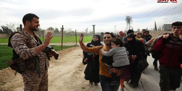 ダマスカス郊外県ではSANA(3月15日付)によると、イスラーム軍が活動を続ける東グータ地方のドゥーマー市の住民数千人が、シリア軍によって設置されたワーフィディーン・ゴラン高原難民キャンプの人道回廊を通じてシリア政府支配地域に退去、シリア軍およびシリア赤新月社などの関係当局がこれを保護した。
