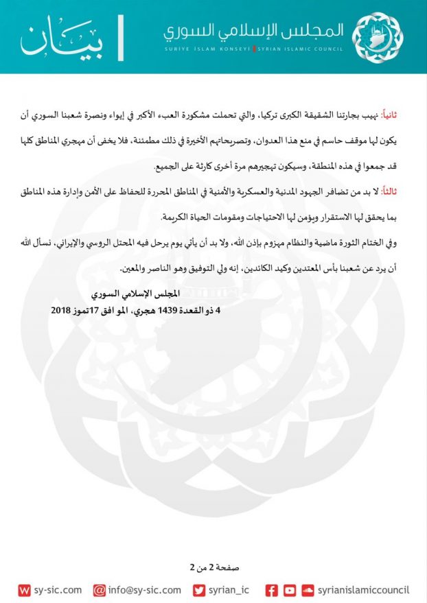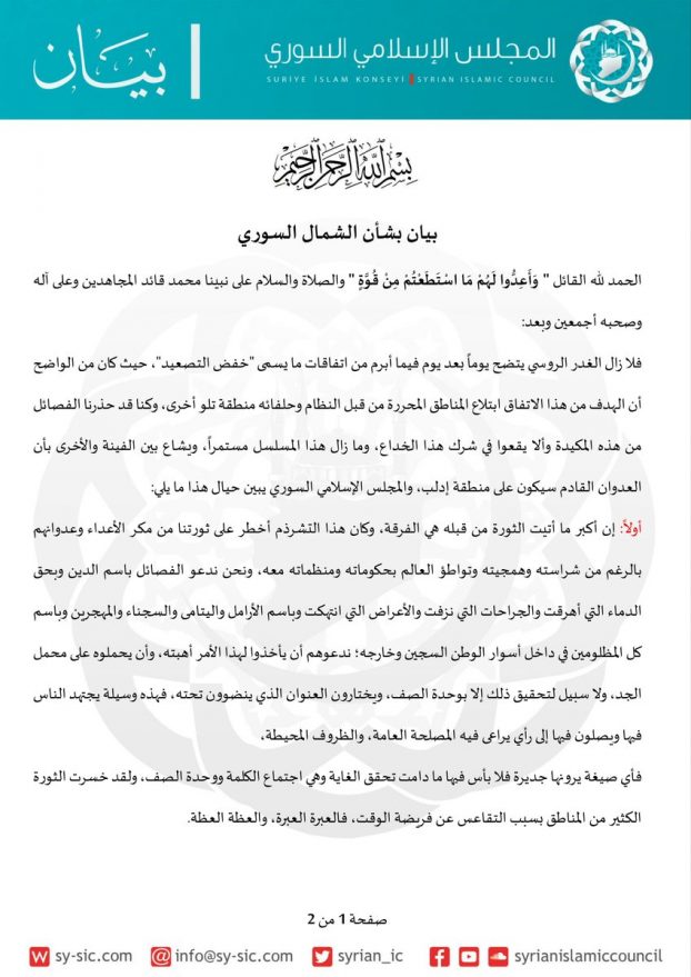 トルコで活動するシリア・イスラーム評議会は声明を出し、イドリブ県で活動する反体制武装集団に対してシリア軍との決戦の準備をするよう呼びかけるとともに、トルコ政府にシリア軍の進行を阻止するための断固たる姿勢をとるよう求めた。
