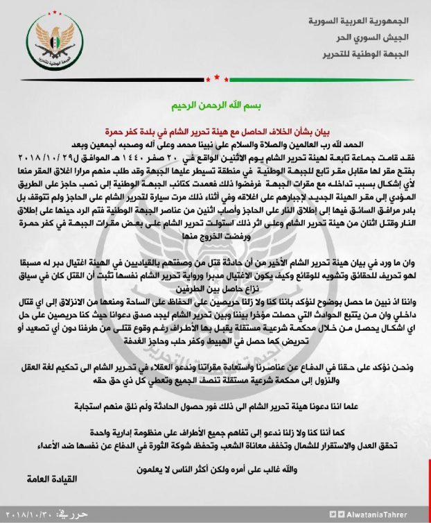 国民解放戦線は声明を出し、28日にアレッポ県カフルハムラ村でのシャーム自由人イスラーム運動、ヌールッディーン・ザンキー運動(いずれも国民解放戦線所属組織)とシャーム解放機構の衝突に関して、「メンバーを防衛し、拠点を奪還する権利」があると主張、シャーム解放機構との対決姿勢を鮮明にした。