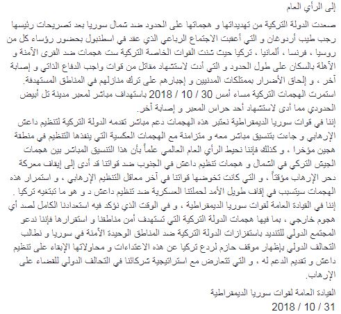 西クルディスタン移行期民政局(ロジャヴァ)人民防衛隊(YPG)主体のシリア民主軍は声明を出し、トルコ軍によるアレッポ県アイン・アラブ(コバネ)市一帯およびラッカ県タッル・アブヤド市一帯への砲撃激化を受けて、ダイル・ザウル県南東部でダーイシュ(イスラーム国)掃討のために続行していた「テロ駆逐の戦い」を中止すると発表した。