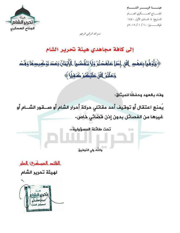 なお、シャーム解放戦線の軍事部門は公示を出し、「解放区」においてシャーム自由人イスラーム運動、シャームの鷹旅団を含む反体制武装集団のメンバーを司法当局の許可なく逮捕することを禁じる旨、メンバーに通達した。