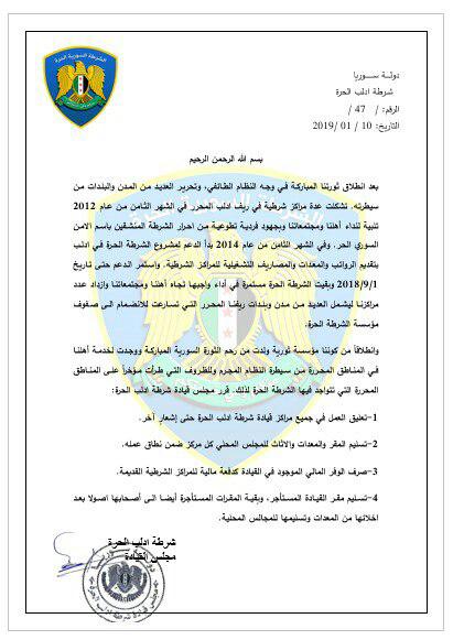 イドリブ自由警察は、シャーム解放機構が国民解放戦線との戦闘の末にイドリブ県を中心とする反体制派支配地域(緊張緩和地帯第1ゾーン)全域を掌握し、同地での戦闘が収束したことを受けて声明を出し、すべてのセンターでの活動を中止し、施設、装備、備品を地元評議会に移譲することなどを決定したと発表した。