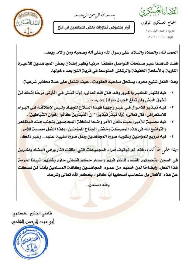 シャーム解放機構軍事部門軍事法廷(アブー・アブドゥッラフマーン・シャーミー判事)は声明を出し、イドリブ県を中心とする反体制派支配地域における軍事・治安権限の移譲にかかる国民解放戦線との合意に基づき、イドリブ県タッフ村に入ったシャーム解放機構のメンバーが軽火器・中火器による発砲を受ける映像がSNS上で拡散されたことに関して、「凶悪」、「処罰に値する」、「革命家のイメージが損なわれる」と批判、武器をジハードのために使用するよう呼びかけた。