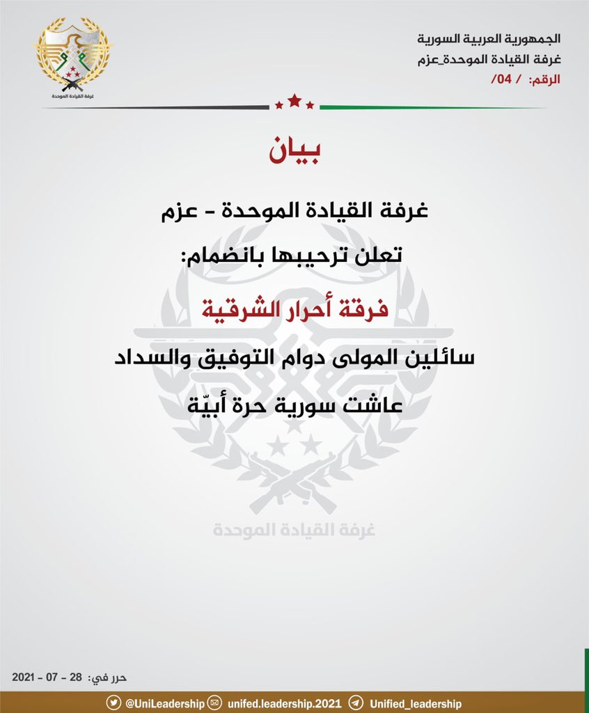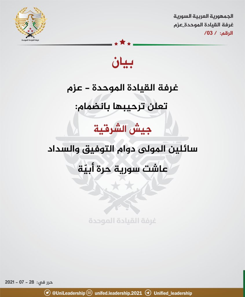 アズム(決意)統合司令室はツイッターのアカウント(https://twitter.com/unileadership)を通じて、シリア国民軍に所属する複数の武装集団を統合したとする声明を相次いで発表した。