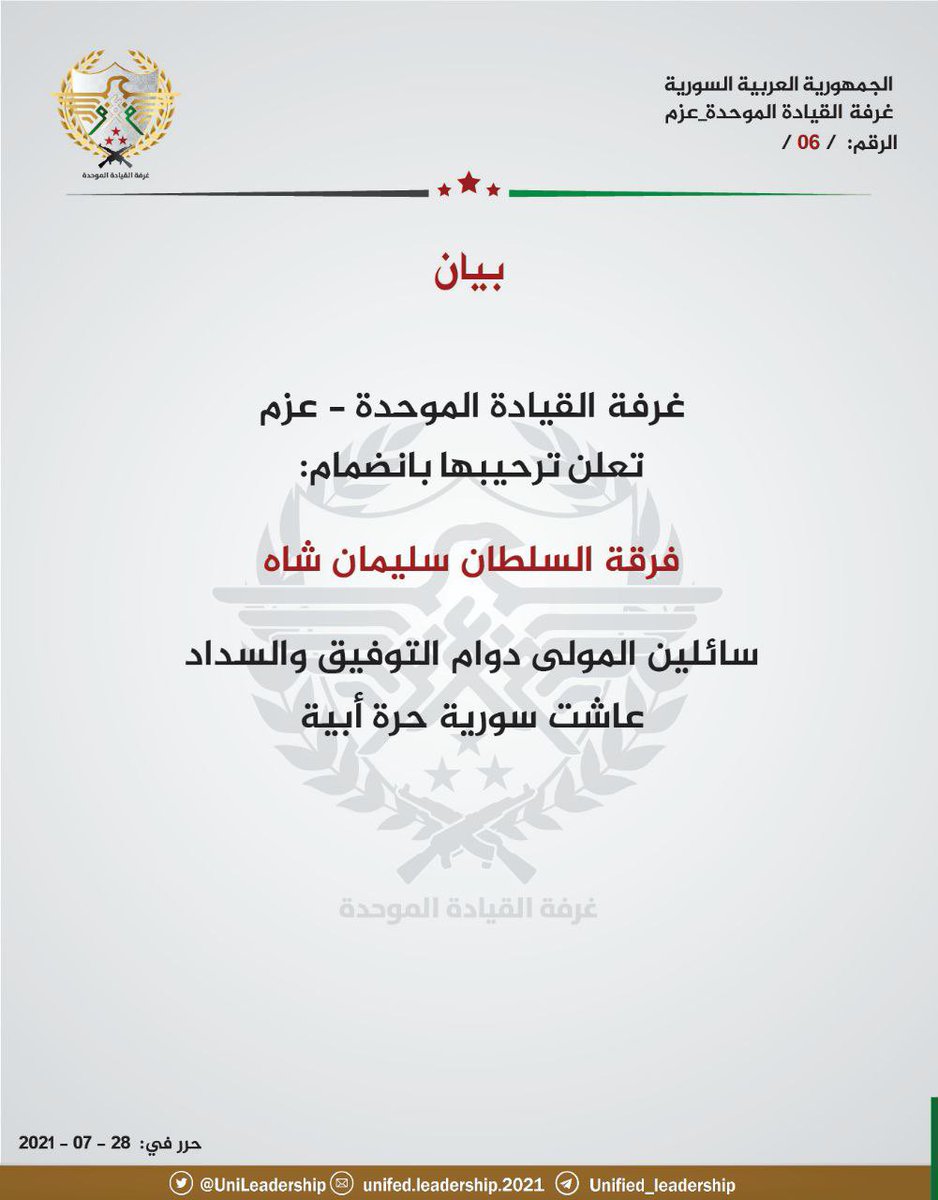 アズム統合司令室は、7月15日にシャーム戦線とスルターン・ムラード師団が数週間にわたる集中協議の末に結成された組織。